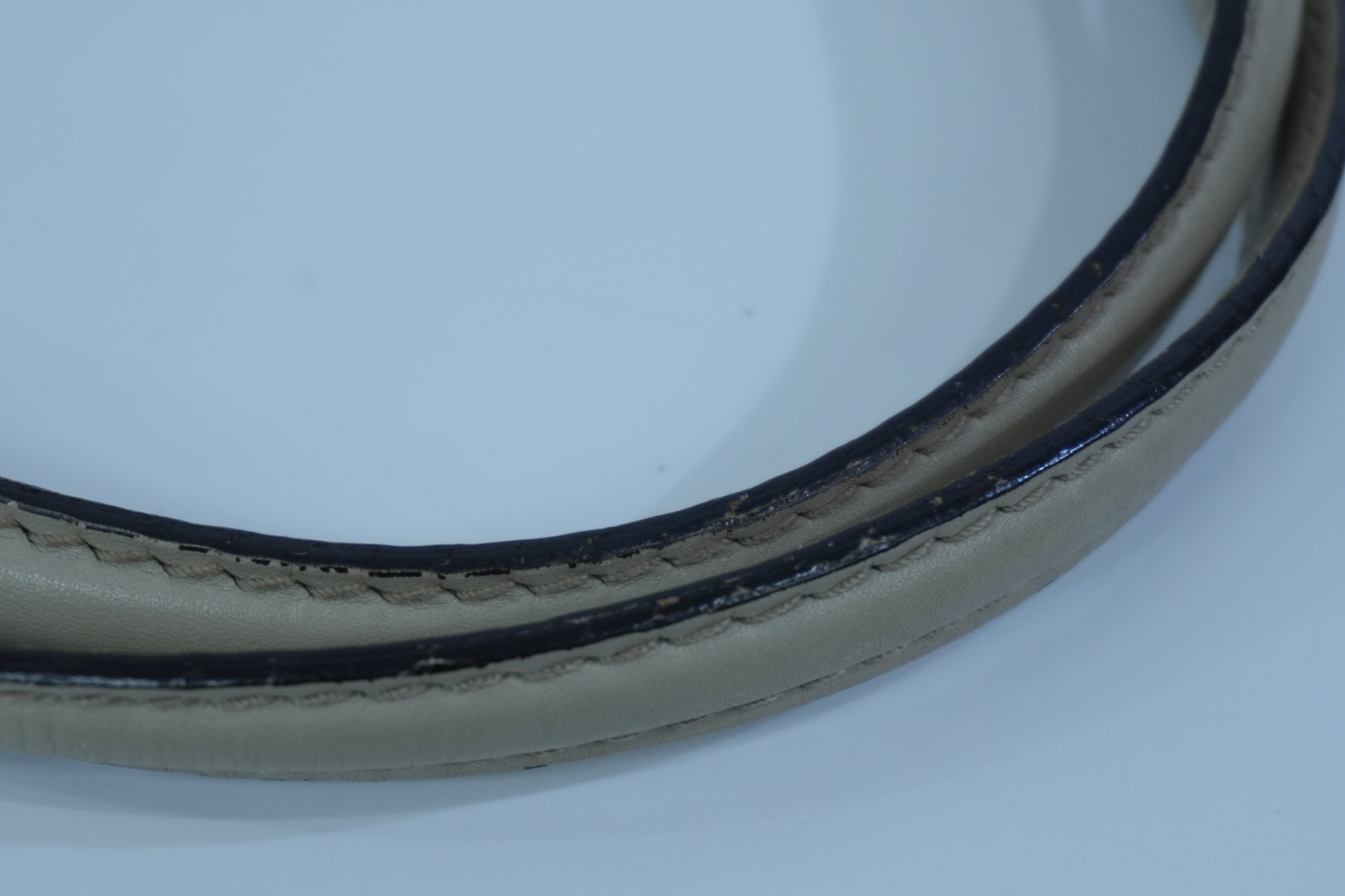 Leather: Signs of usage. Bottom corners have rubs, glazing has surface cracks, and chaps are fraying. No major damage.