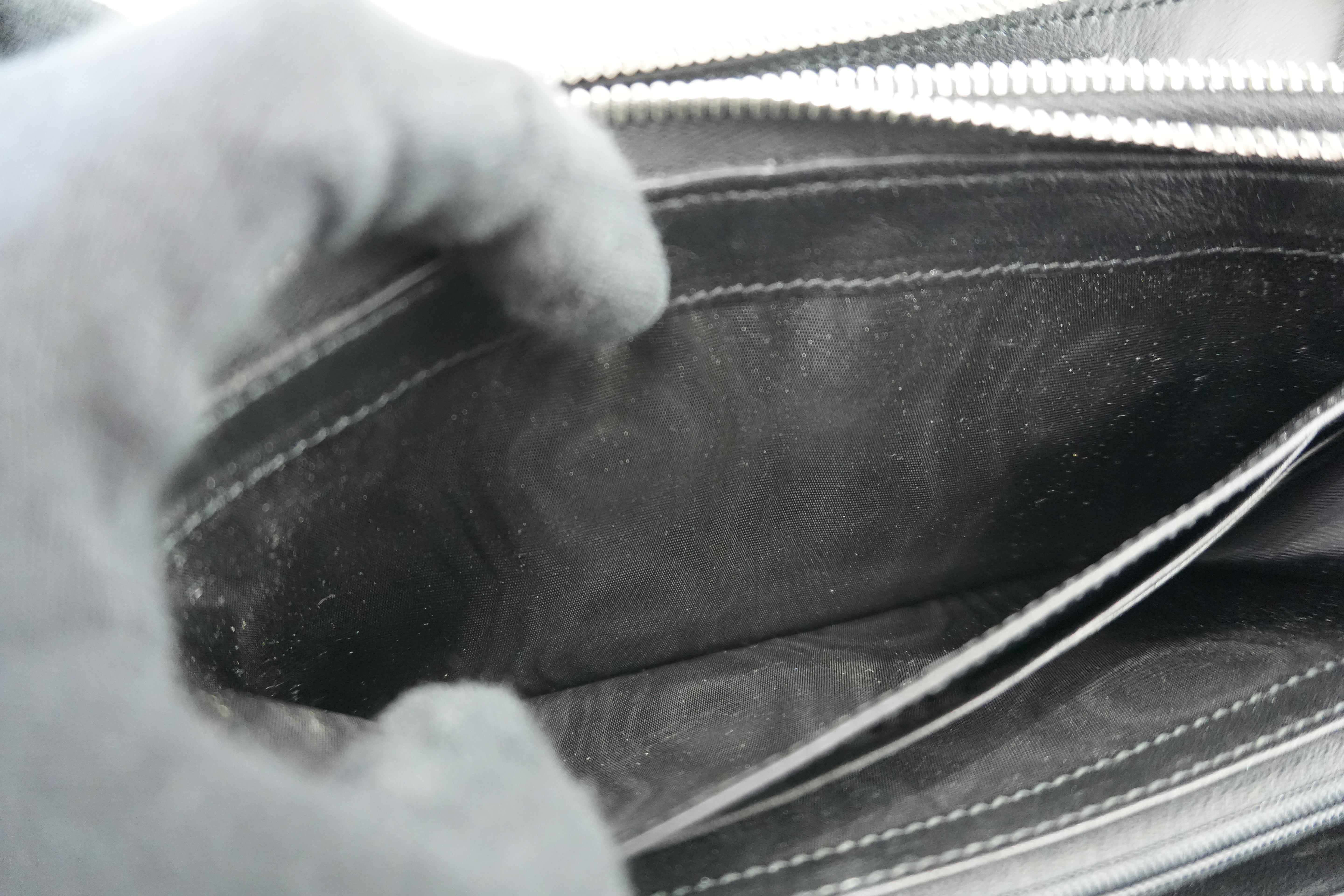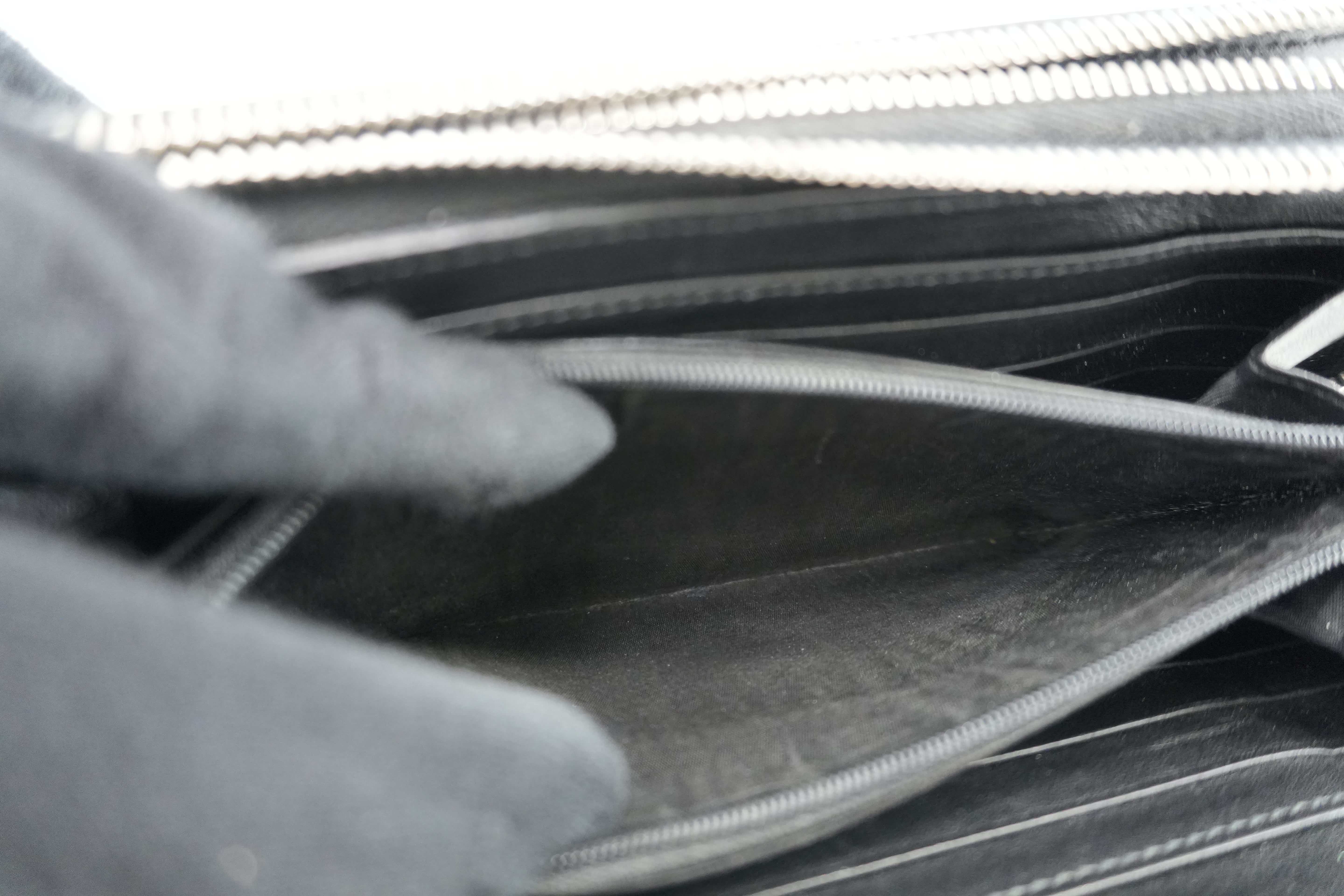Leather: The body is in good condition and no major damage. The corners have rubs. The zipper pull has cracks.