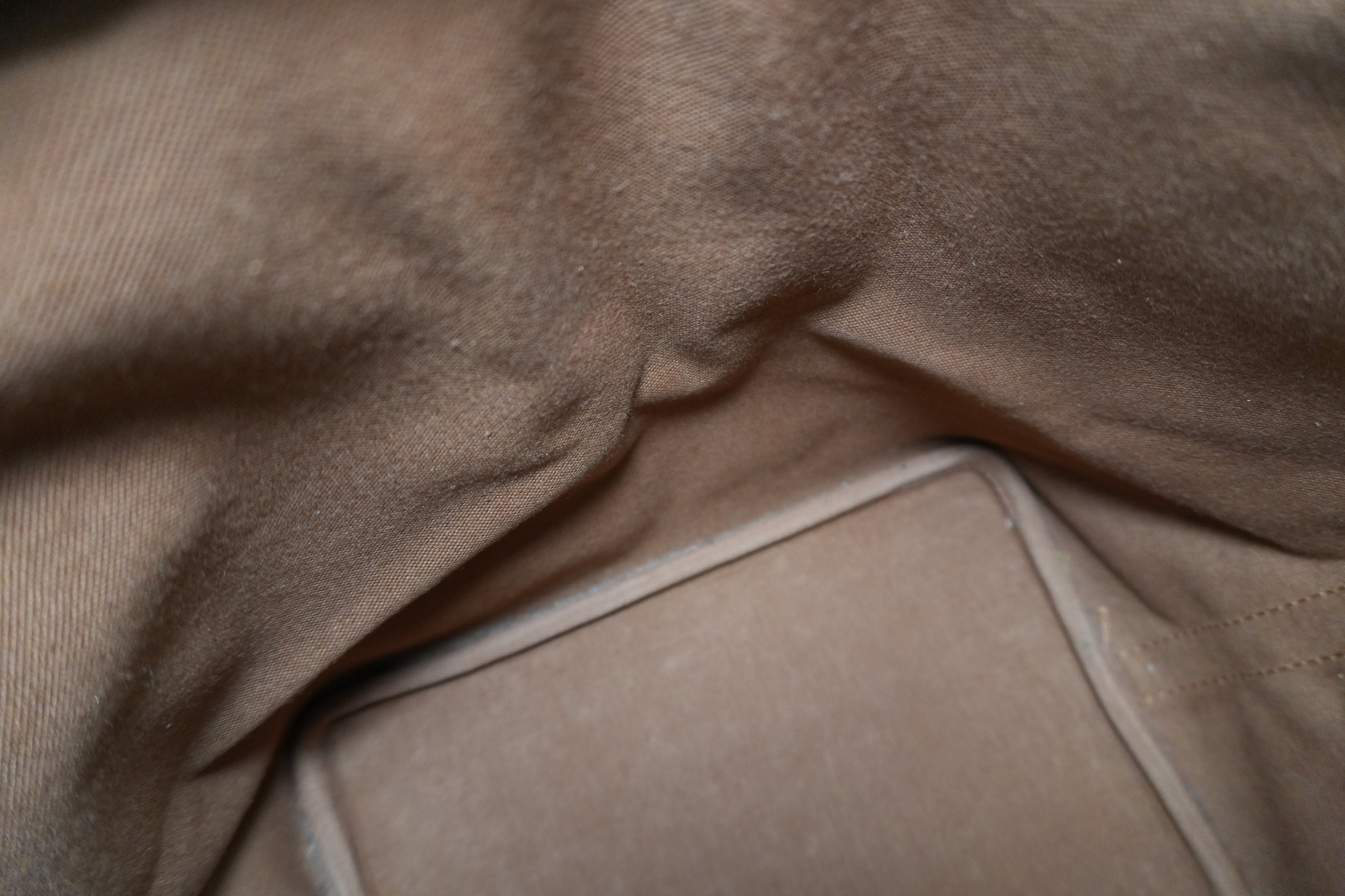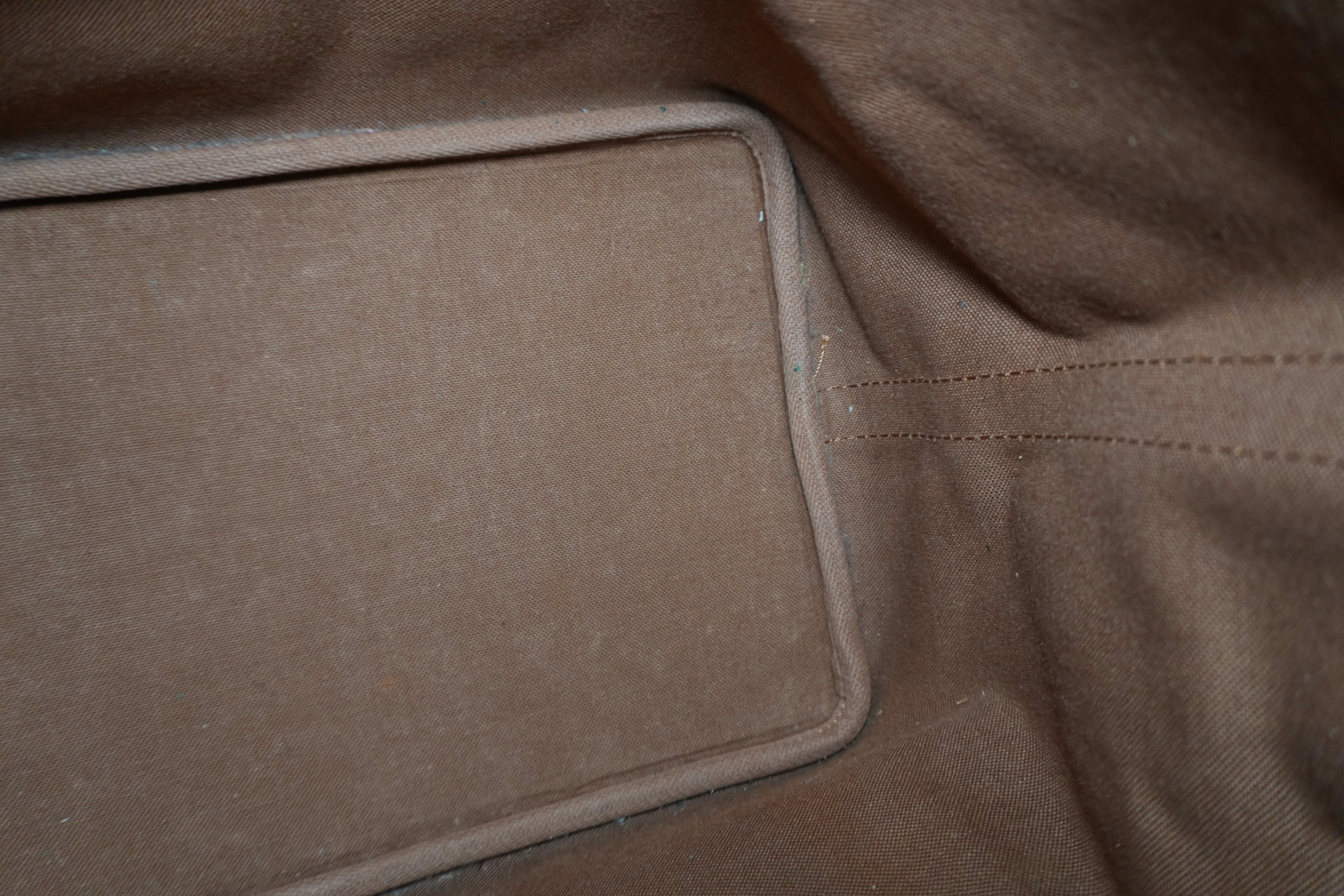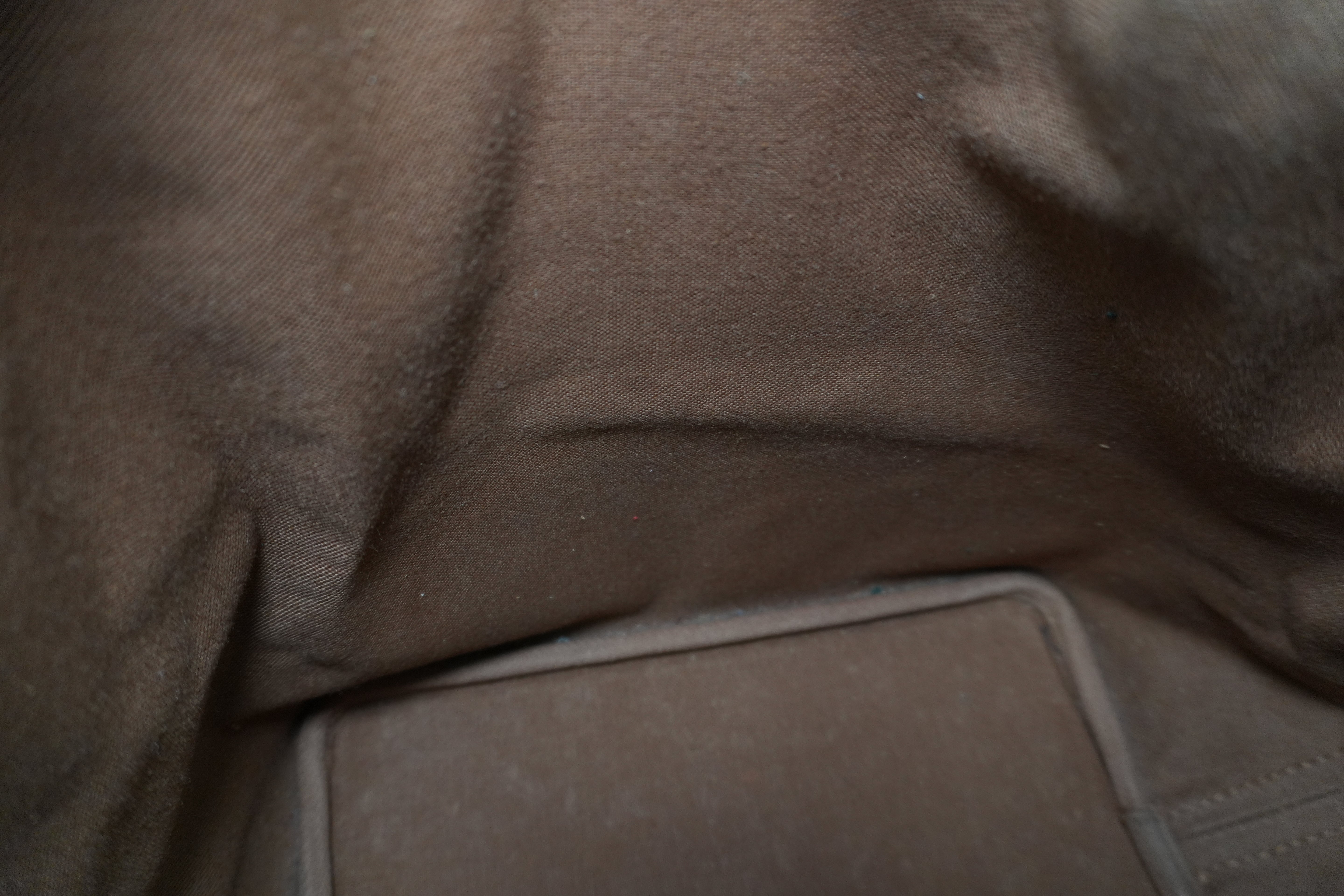 Leather: Signs of usage. Bottom part has dirt, opening trim has rubs, and one side of the bands is creasing.