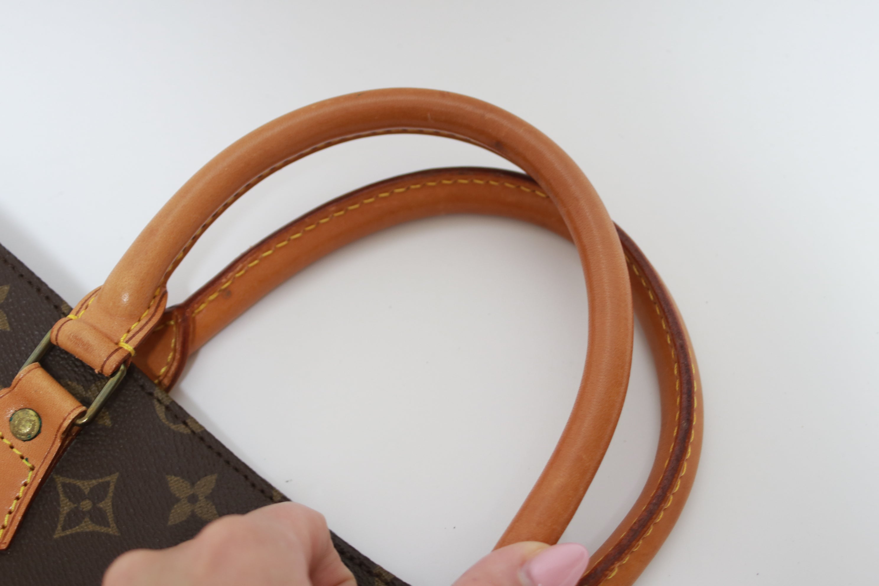 - Leather/ Vachetta: The leather part is in good condition with some rubs, but no major damage
